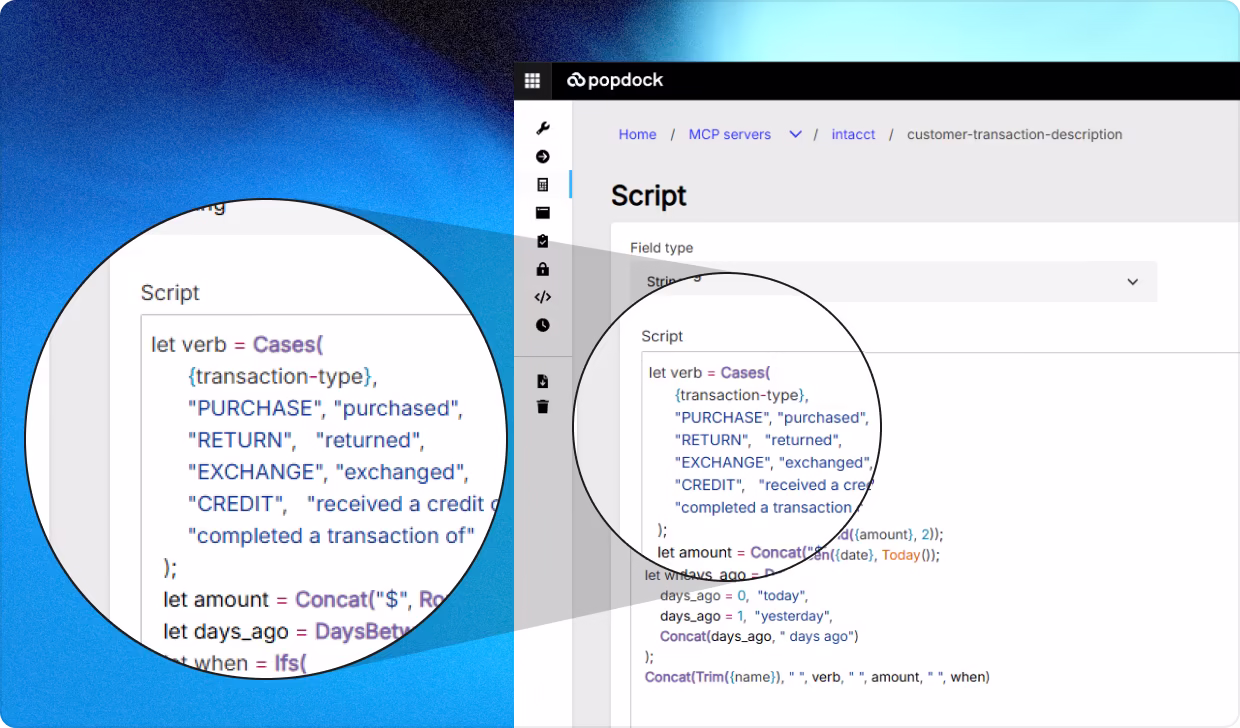 PopdockAI Script is a specialized scripting language designed specifically for the calculations, validations, and transformations that businesses need every day. Unlike general-purpose programming languages, PopdockAI Script focuses on making common business operations simple while providing the power to handle complex scenarios.