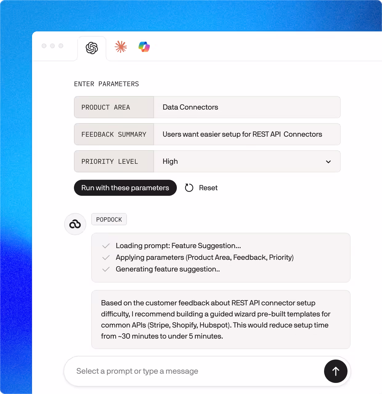 PopdockAI includes intelligent parameter validation that ensures every prompt executes flawlessly, every time. Before your AI assistant even sees a prompt, we validate all user inputs against your defined requirements, checking data types, formats, ranges, and business rules automatically.