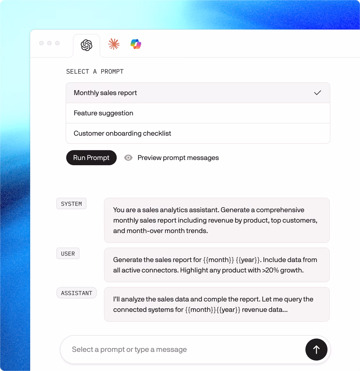 One well-designed prompt can serve multiple related use cases rather than requiring separate prompts for each variation. You build once, then users adapt it to their exact needs, striking the perfect balance between reusability and customization.