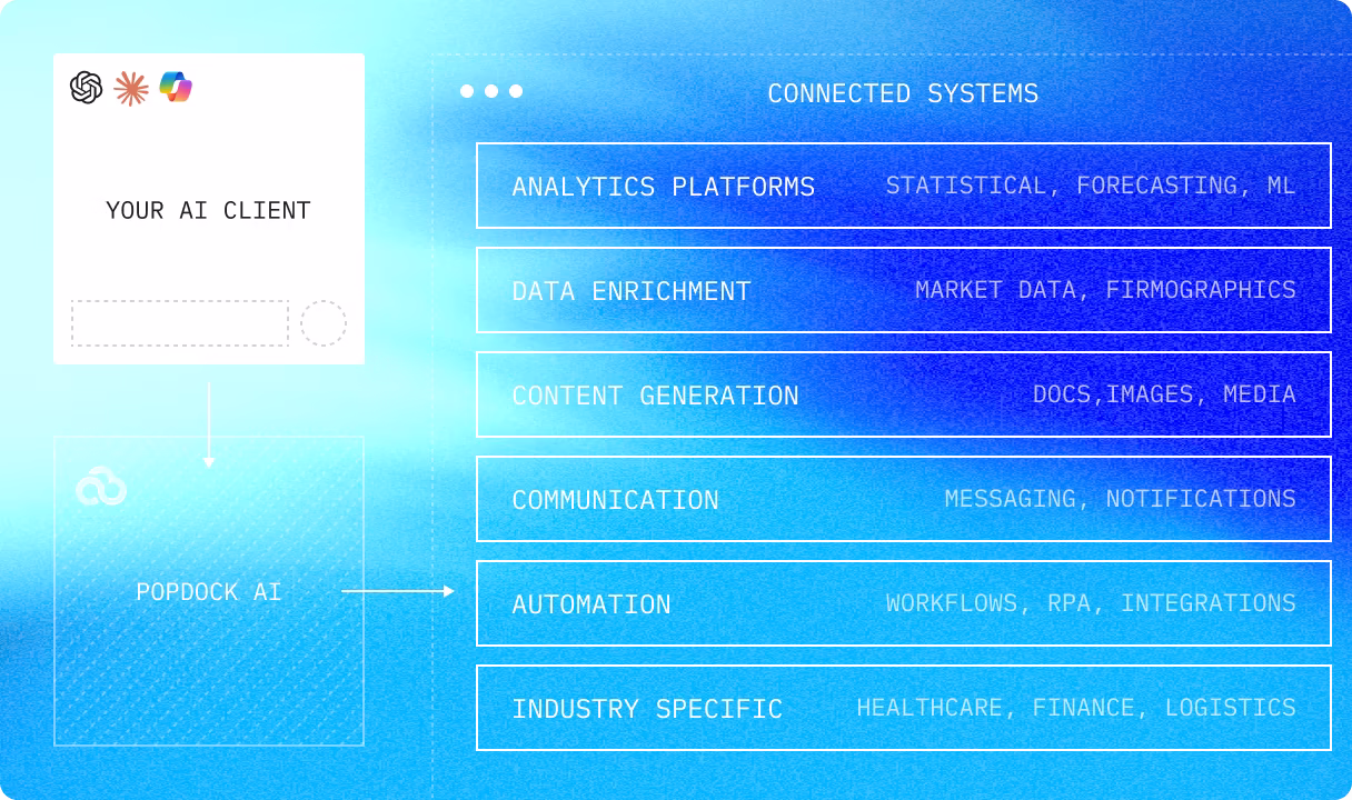 The MCP ecosystem is evolving rapidly with new tools, services, and capabilities constantly emerging. PopdockAI's third-party integration ensures you can adopt innovation as it appears without rebuilding your infrastructure.