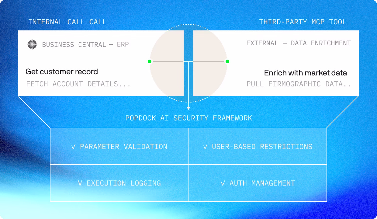 Integration shouldn't mean compromise. Third-party tools integrated through PopdockAI inherit your security framework, ensuring consistent governance across all capabilities.